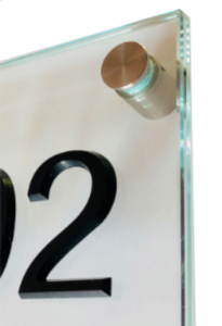 Durch die Verwendung von hochwertigem Glas mit gefasten und polierten Kanten und in Verbindung mit den Schilderhaltern aus poliertem Edelstahl ergibt sich der exklusive Charakter dieses Schildersystems.